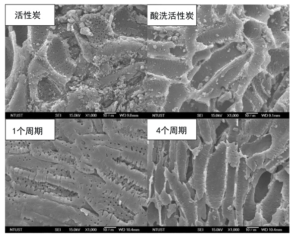 通過酸洗的活性炭和活性炭在顯示圖2中,SEM成像還透露,酸洗除去的雜質(zhì),從而產(chǎn)生的孔結(jié)構(gòu)具有一個(gè)看似光滑的表面。與原始活性炭相比,酸洗活性炭的比表面積和總孔體積略大。這可能是在酸洗過程中去除了其他化學(xué)物質(zhì)(例如氧氣)的影響。然而,酸洗似乎對(duì)活性炭的孔徑幾乎沒有影響。原始活性炭和新鮮活性炭的平均孔徑表明,絕大多數(shù)孔都屬于微孔范圍。
