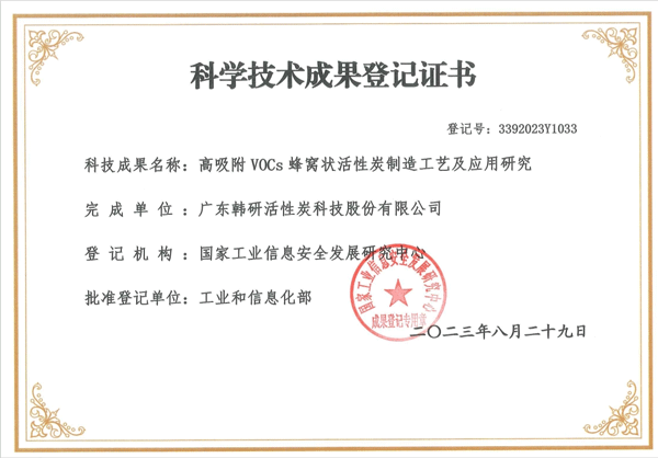 本次科學(xué)技術(shù)成果鑒定由國(guó)家工業(yè)信息安全發(fā)展研究中心依據(jù)《中華人民共和國(guó)科學(xué)技術(shù)進(jìn)步法》、《中華人民共和國(guó)促進(jìn)科技成果轉(zhuǎn)化法》、《科學(xué)技術(shù)評(píng)價(jià)辦法》、《科技評(píng)估管理暫行辦法》,在北京主持召開(kāi)由韓研股份研發(fā)的“高吸附 VOCs 蜂窩狀活性炭制造工藝及應(yīng)用研究”科技成果評(píng)價(jià)會(huì)。期間嚴(yán)格按照《科技成果評(píng)價(jià)試點(diǎn)暫行辦法》的有關(guān)規(guī)定和要求,秉承客觀、公正、獨(dú)立的原則,聘請(qǐng)專家對(duì)該項(xiàng)科技成果進(jìn)行評(píng)價(jià)。評(píng)價(jià)委員會(huì)聽(tīng)取了項(xiàng)目完成單位的技術(shù)總結(jié)報(bào)告,對(duì)評(píng)價(jià)資料進(jìn)行了審查,經(jīng)嚴(yán)格質(zhì)詢和充分討論形成一致意見(jiàn):本技術(shù)成果達(dá)國(guó)際先進(jìn)水平。